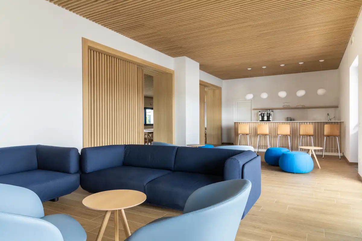 Các khu vực chung chào đón người chơi, huấn luyện viên và khách trong bầu không khí thân thiện, hòa đồng và sôi nổi. Khu vực thư giãn và chăm sóc sức khỏe mang đến một không gian yên tĩnh để phục hồi thể chất và tinh thần, đặc trưng bởi thiết kế tinh tế và bảng màu chủ yếu là đơn sắc, với gỗ làm vật liệu chính. Những nét chấm phá của màu xanh đặc trưng của Como bổ sung cho tính thẩm mỹ.