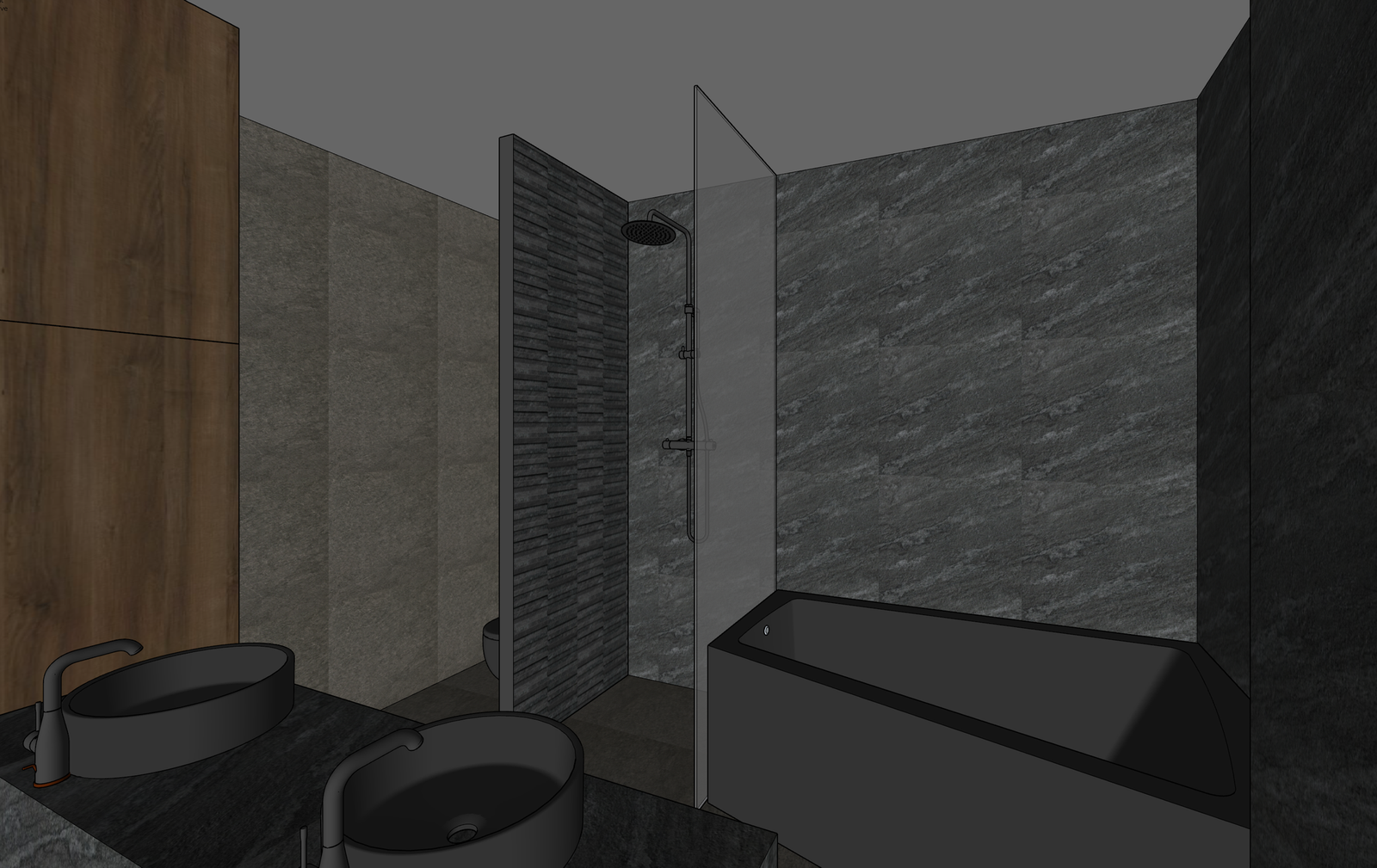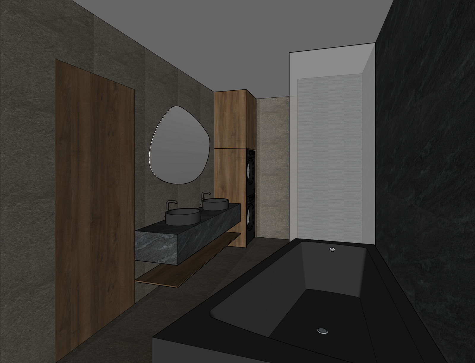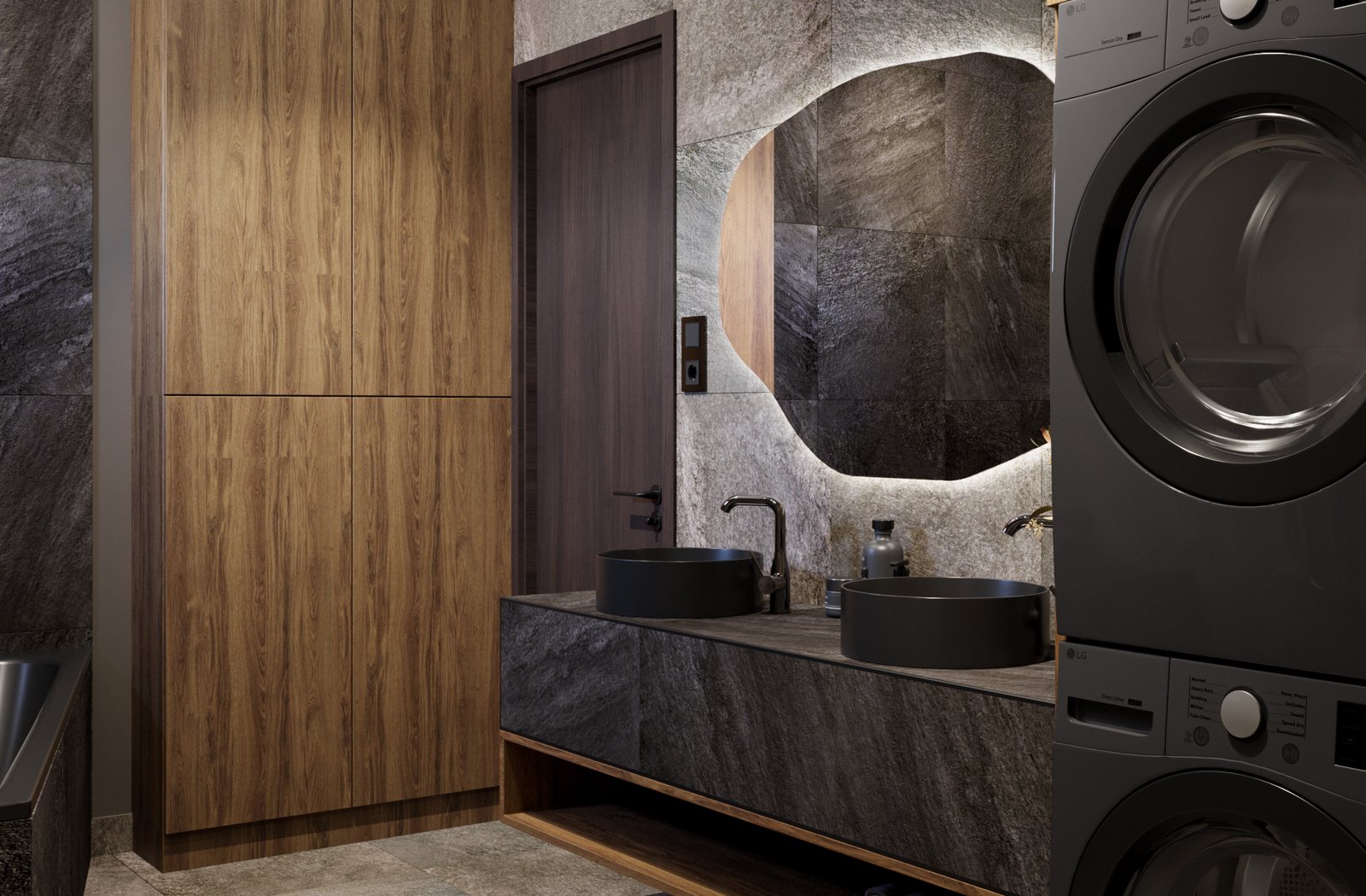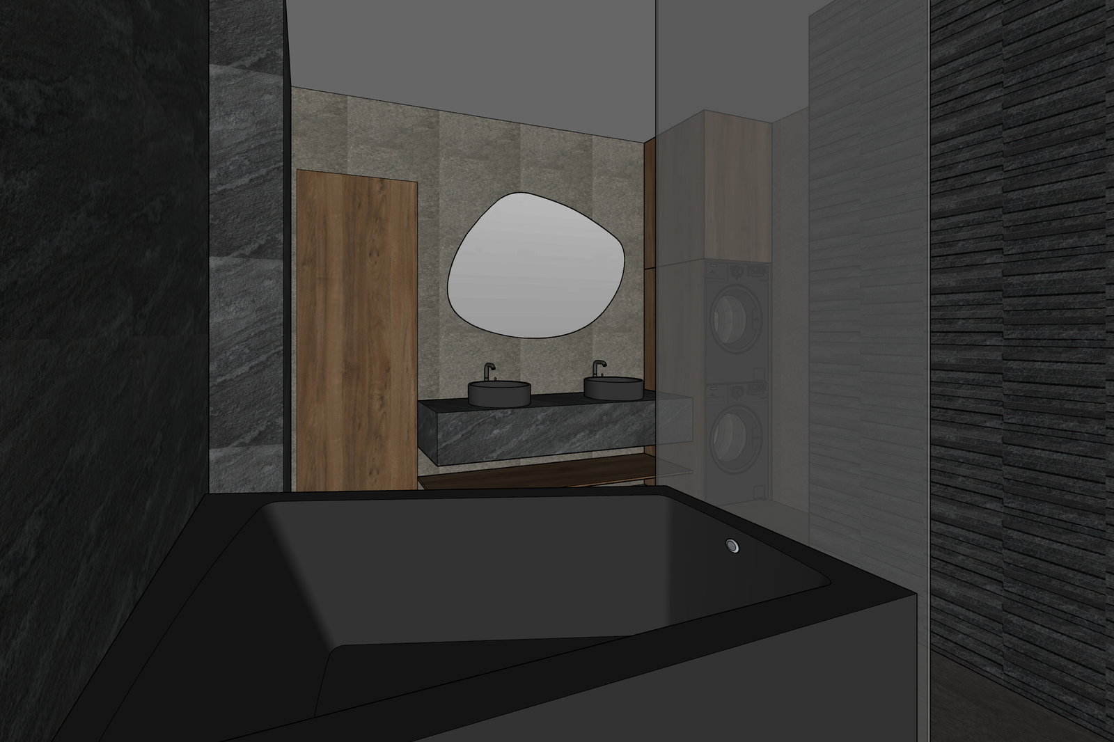 Phòng tắm chính sử dụng tông màu đất trầm, trong đó các bề mặt màu xám hai tông màu trải dài liền mạch trên sàn và tường, được tô điểm thêm bằng tủ gỗ óc chó ấm áp và đồ đạc màu đen tinh tế giúp nâng cao cảm giác sang trọng và tinh tế.