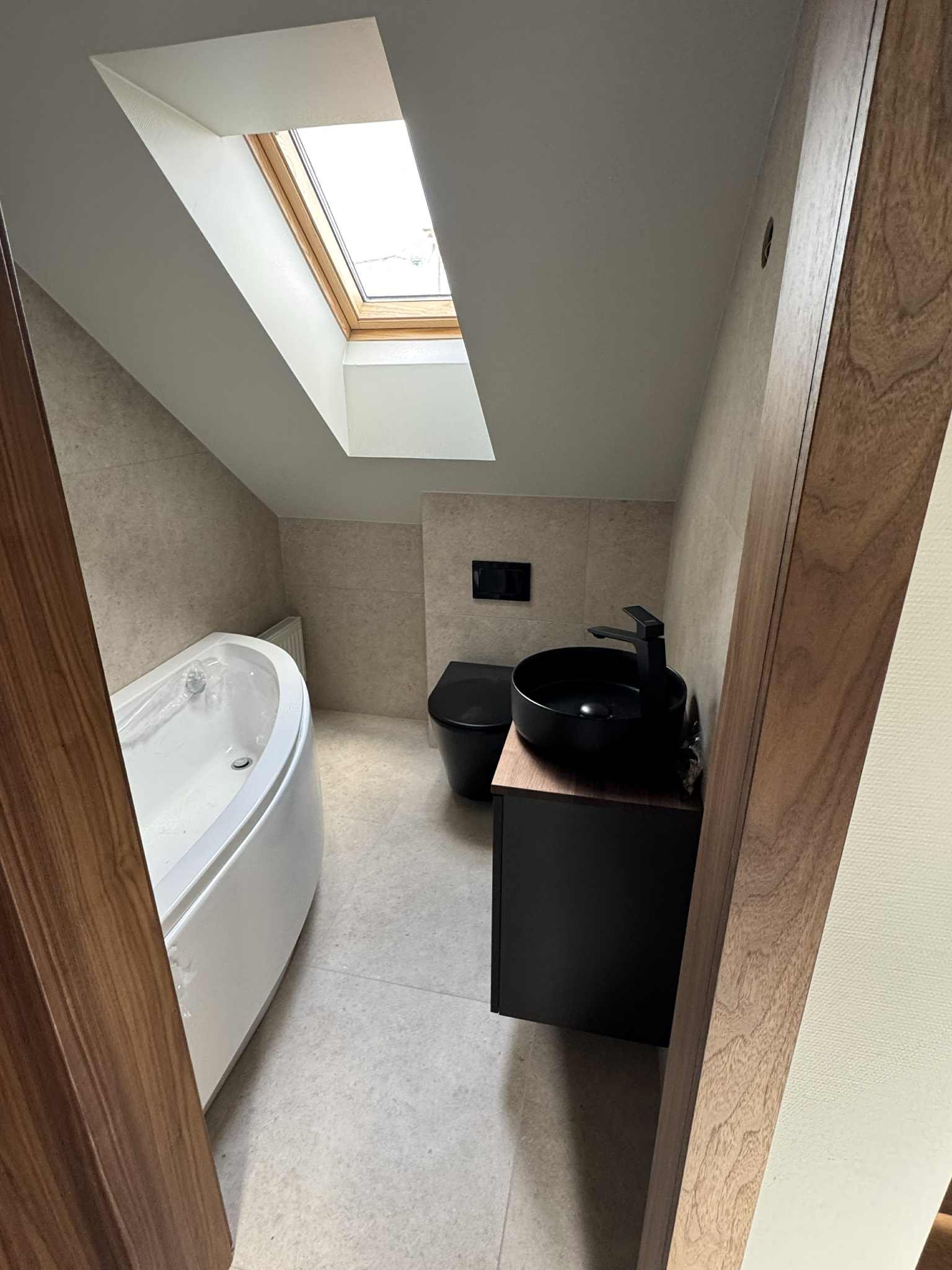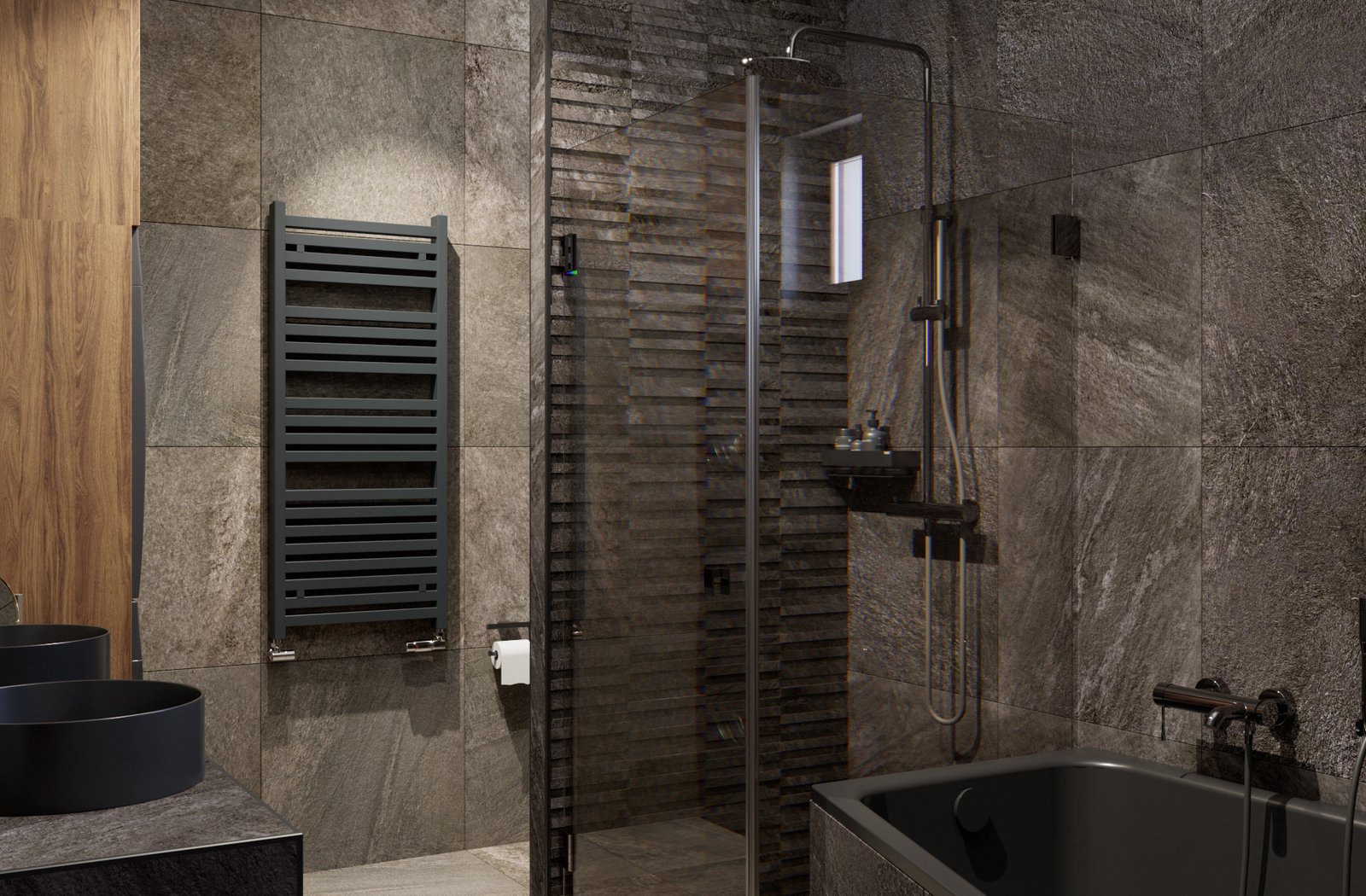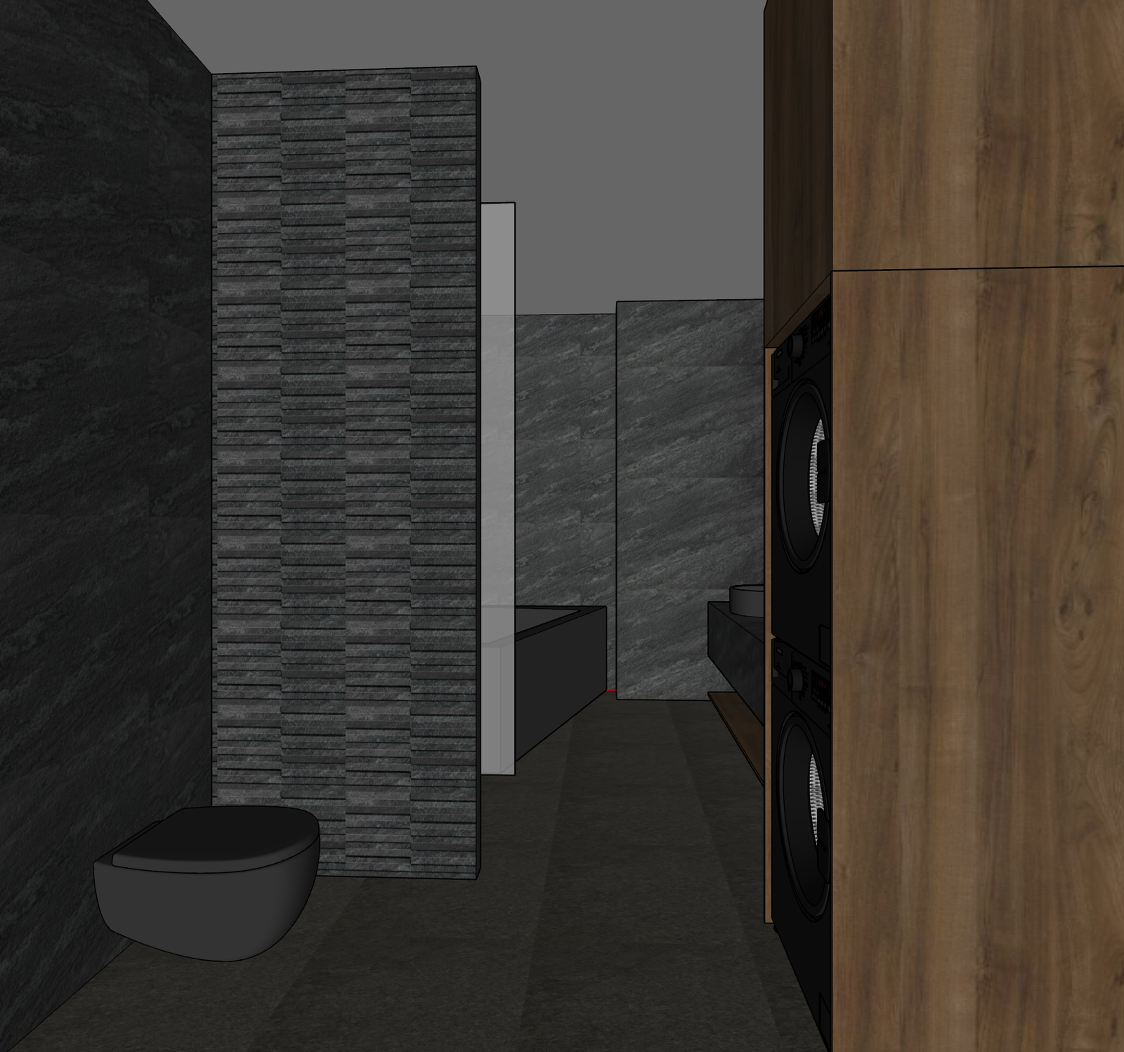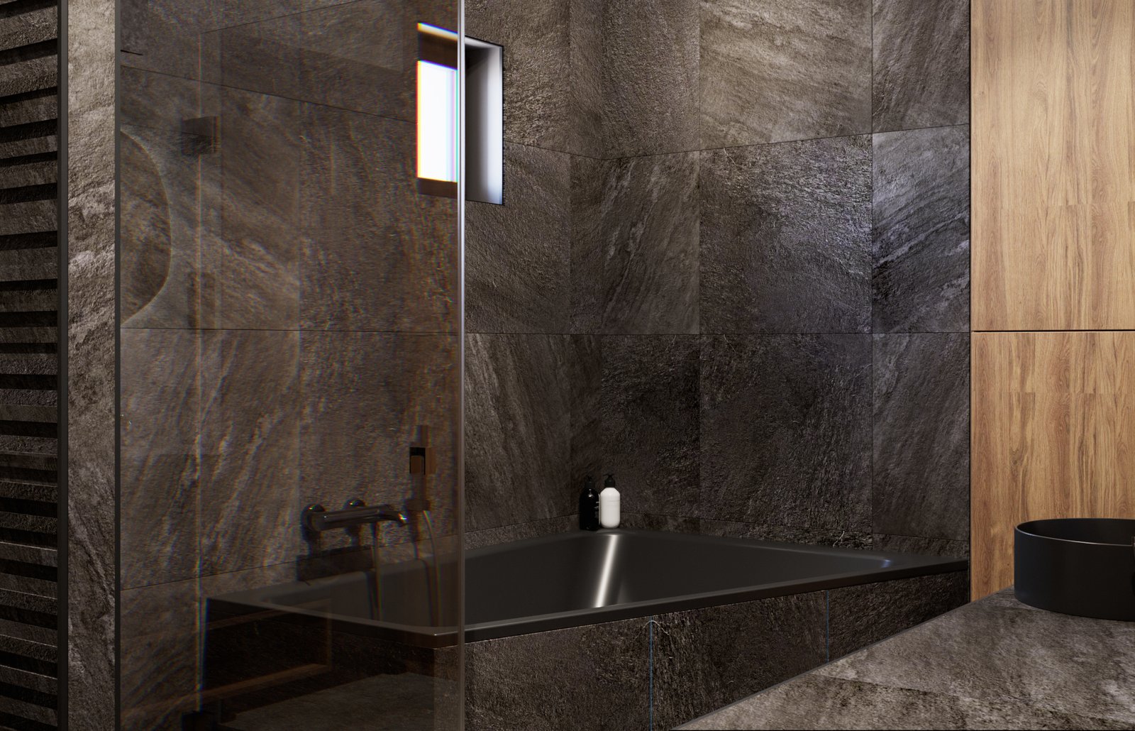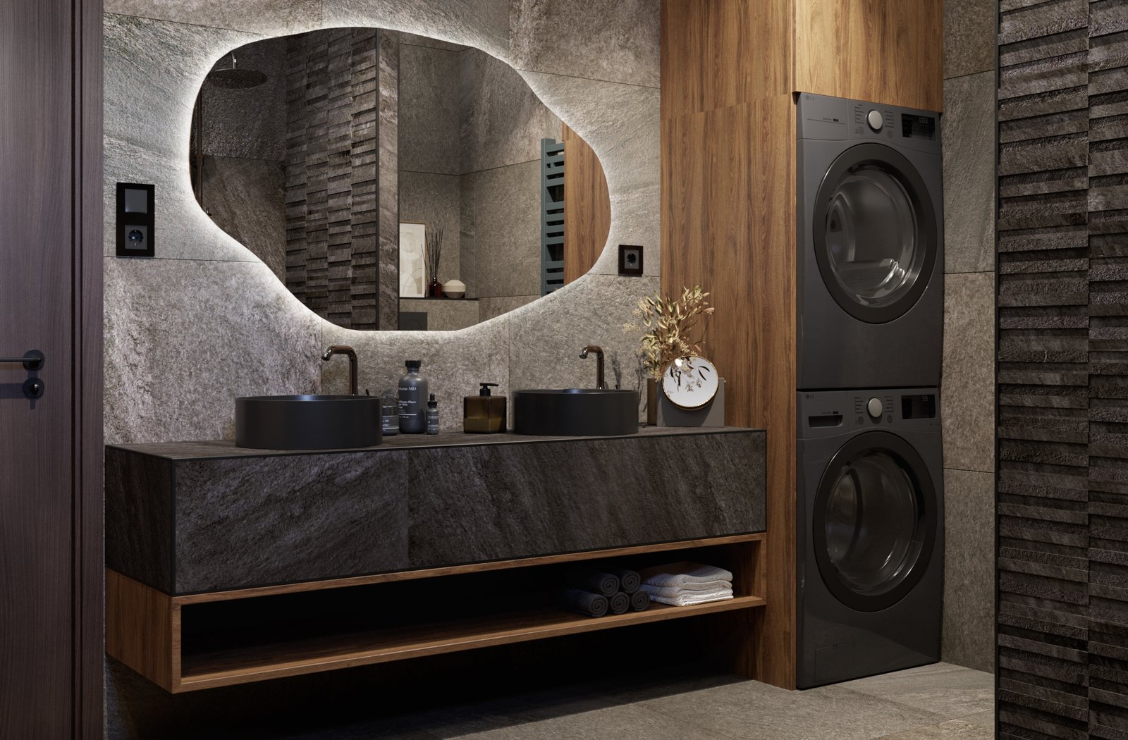 Phòng tắm chính sử dụng tông màu đất trầm, trong đó các bề mặt màu xám hai tông màu trải dài liền mạch trên sàn và tường, được tô điểm thêm bằng tủ gỗ óc chó ấm áp và đồ đạc màu đen tinh tế giúp nâng cao cảm giác sang trọng và tinh tế.
