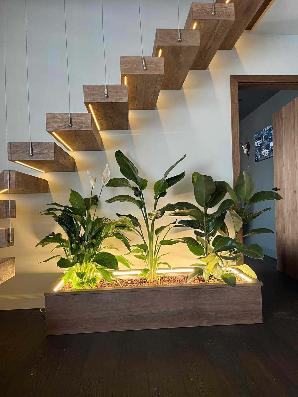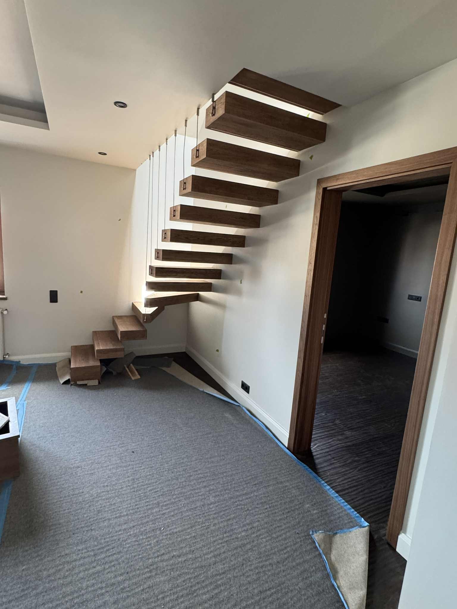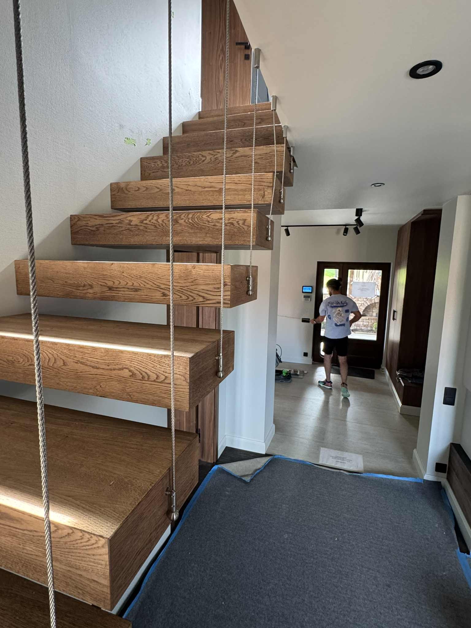 Phòng khách được nâng lên bằng một cầu thang treo nổi bật trông như đang lơ lửng, truyền vào không gian sự nhẹ nhàng thanh tao và sự sang trọng trong kiến trúc.