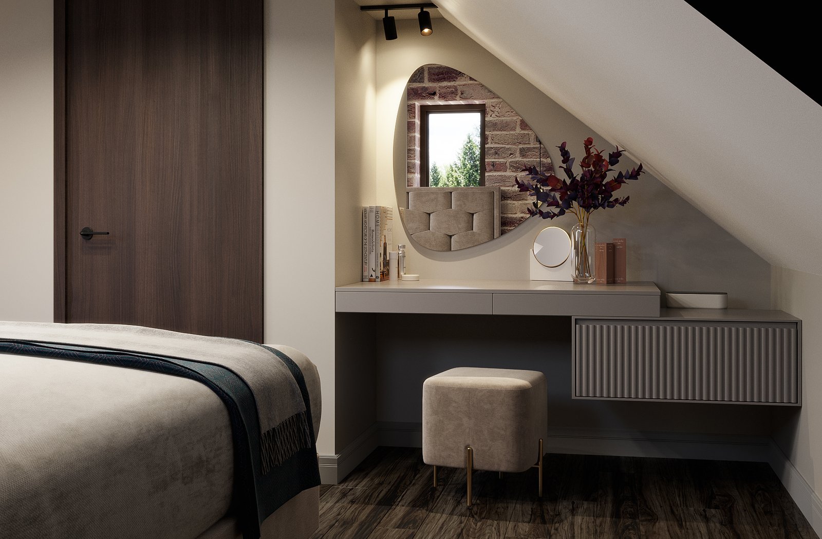 Ẩn mình trong góc, bàn trang điểm và bàn trang điểm duyên dáng sẽ tăng thêm vẻ sang trọng mà bất kỳ người phụ nữ nào cũng phải ghen tị.