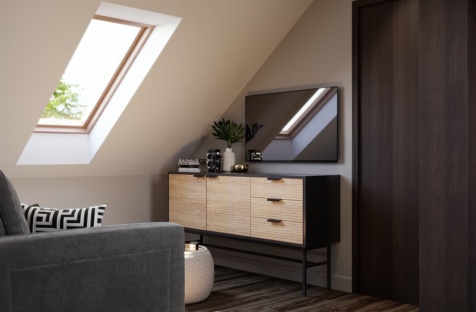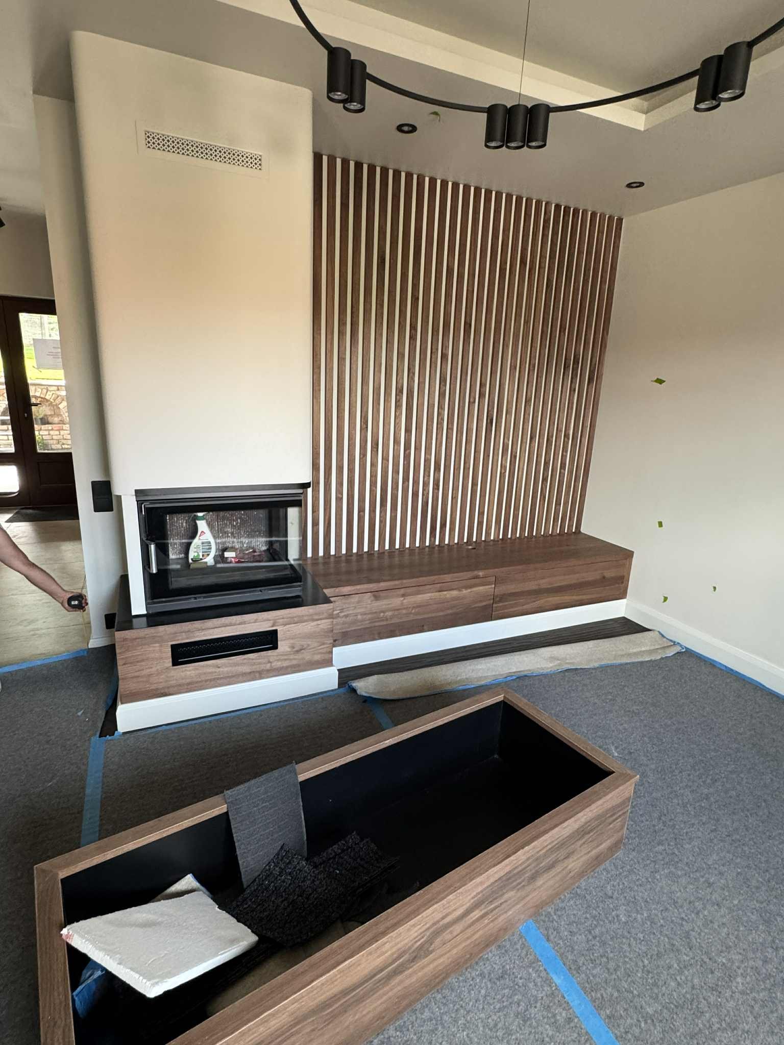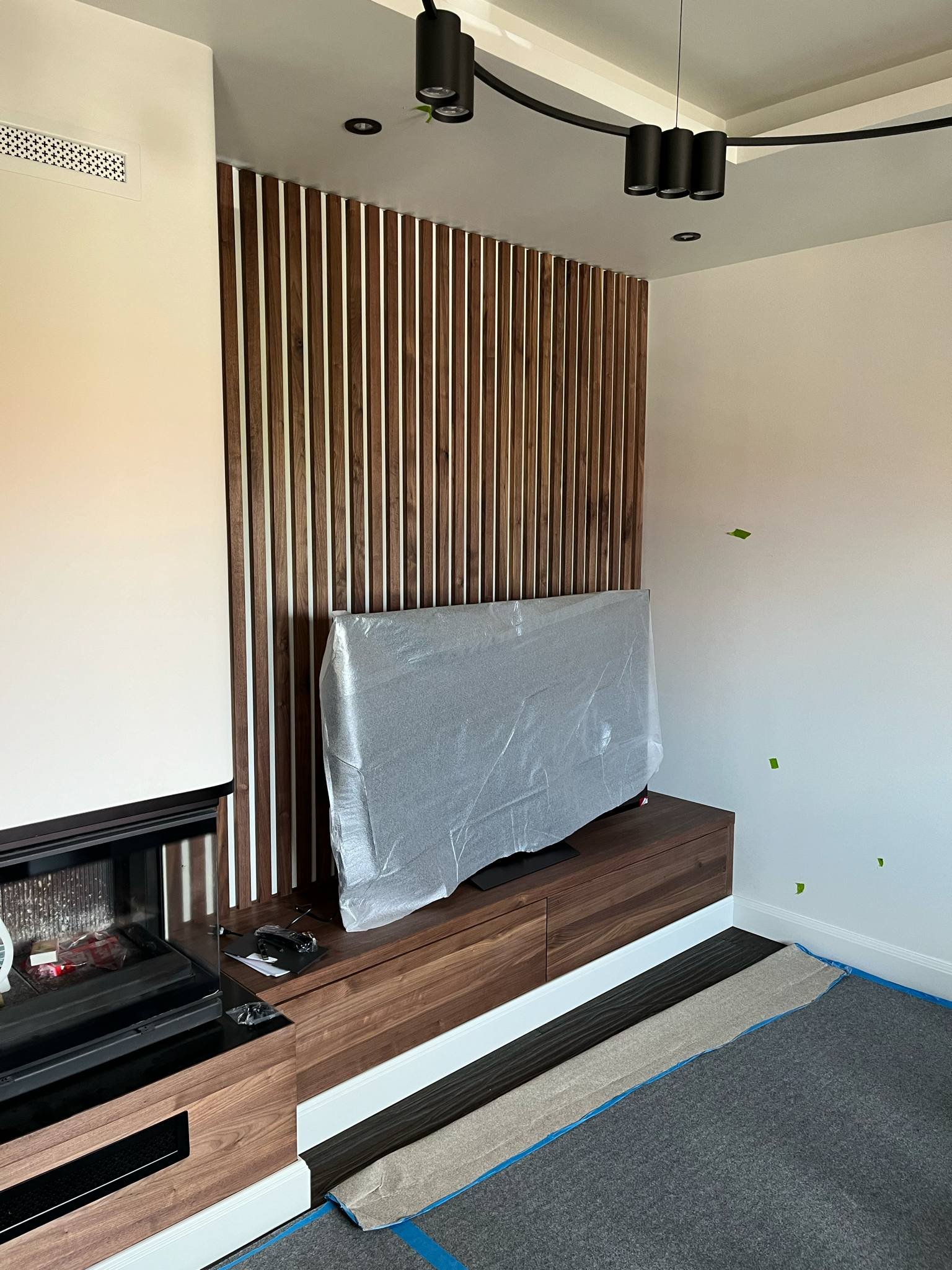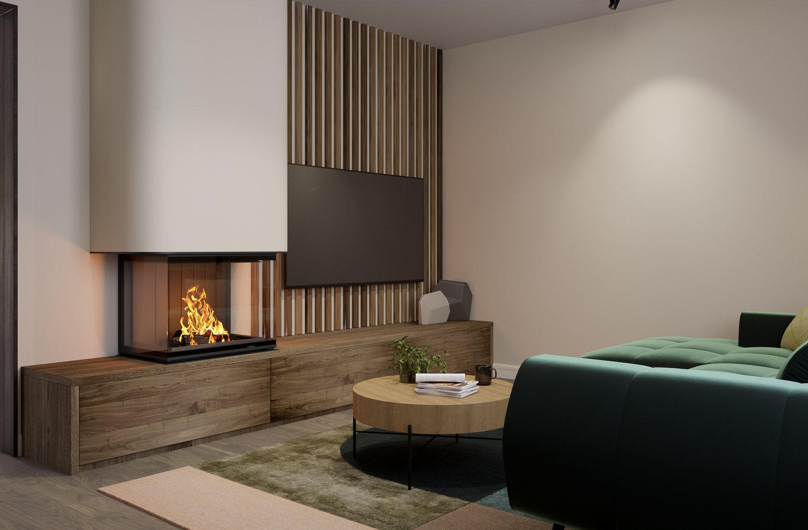 Thiết kế lò sưởi hiện đại kết hợp với tấm ốp tường bằng gỗ óc chó tạo nên bầu không khí ấm áp và lôi cuốn.