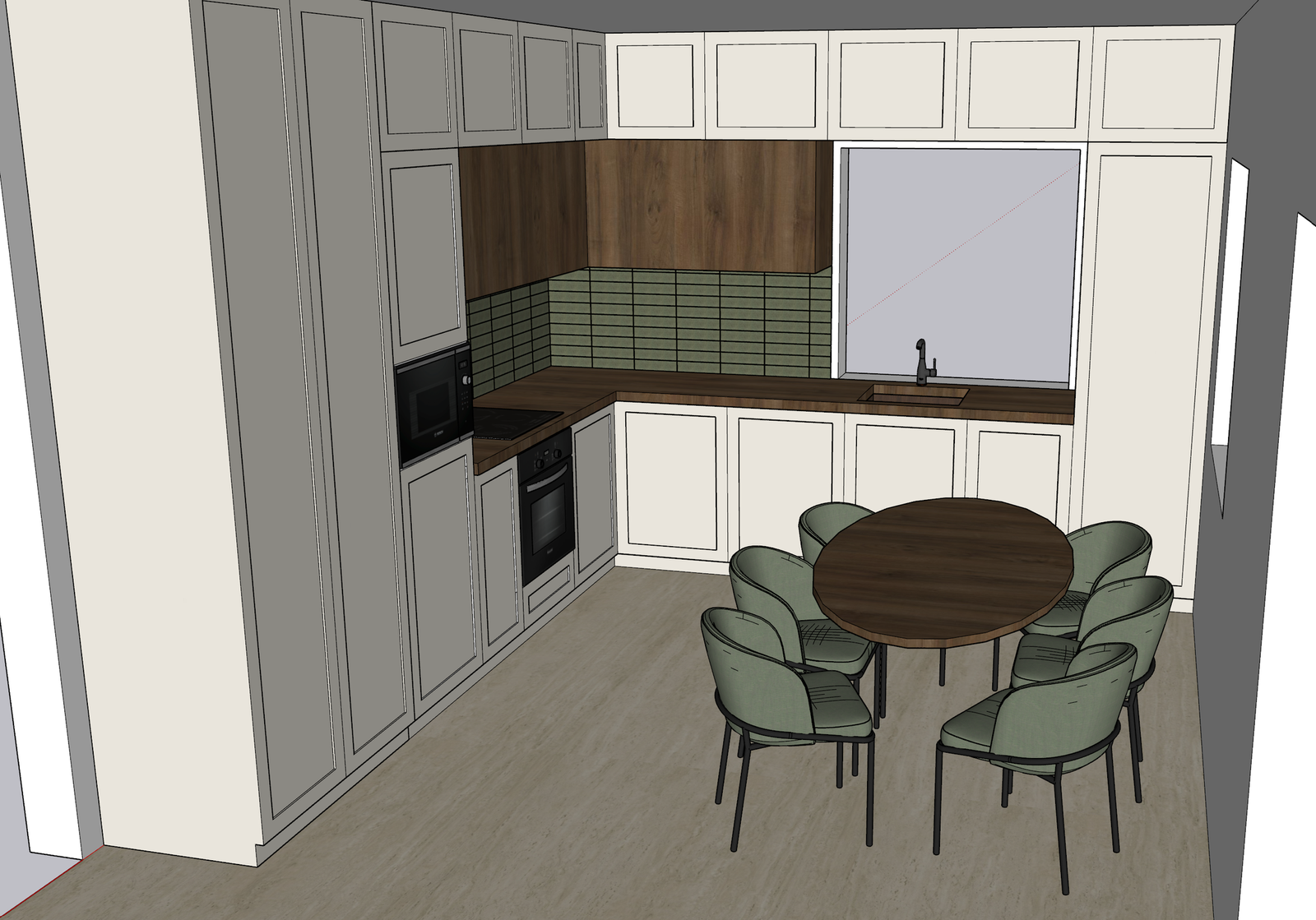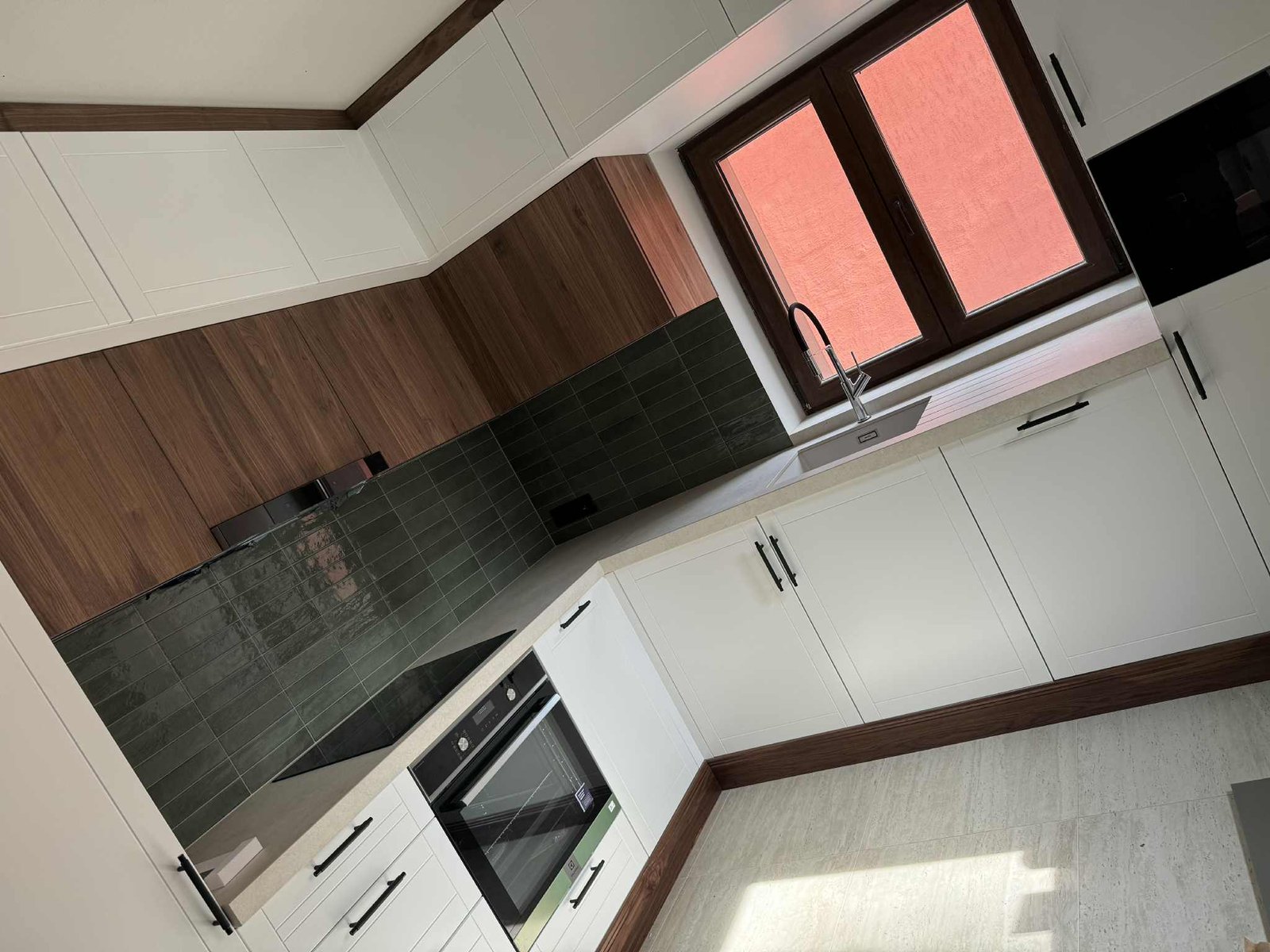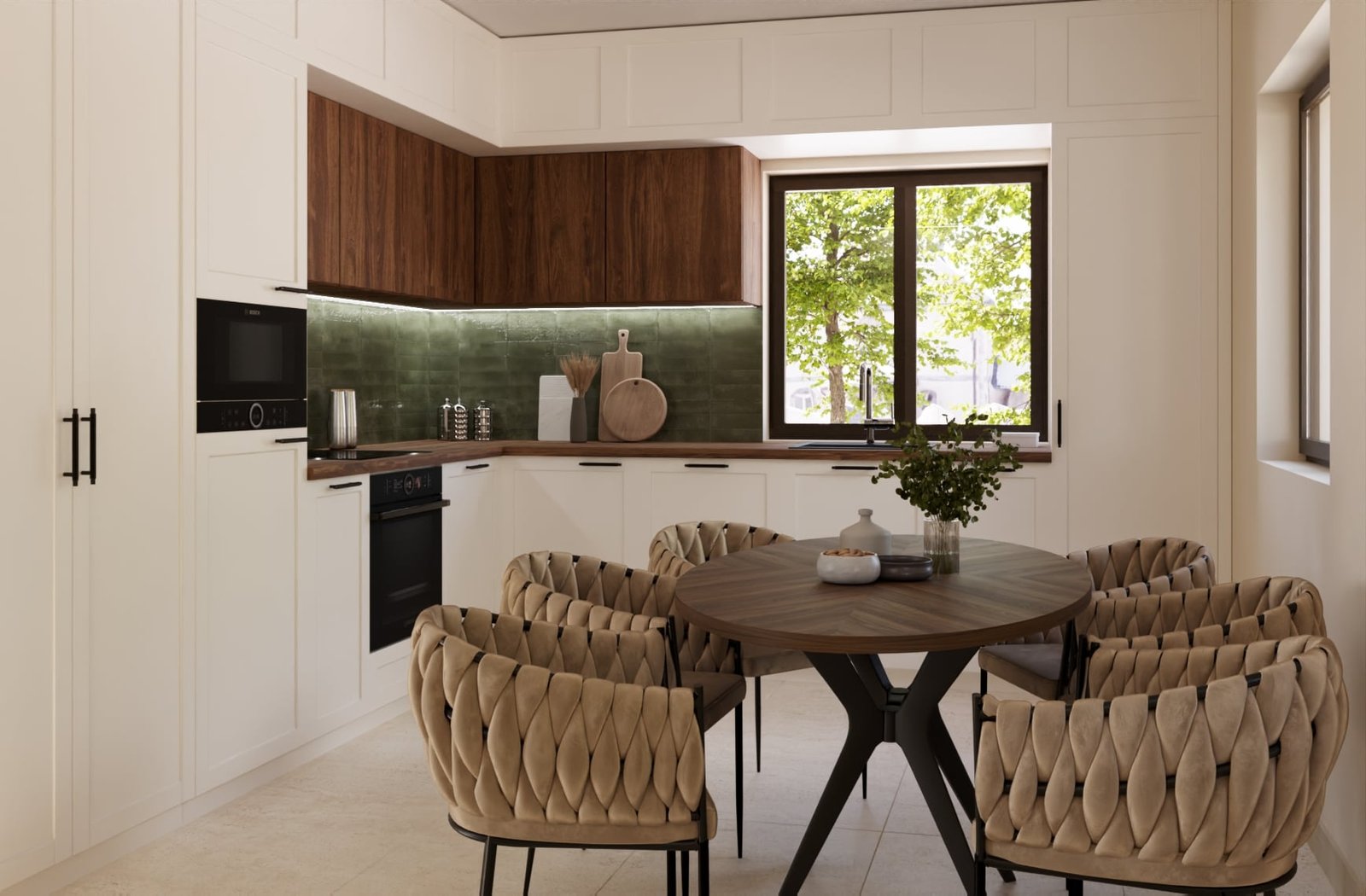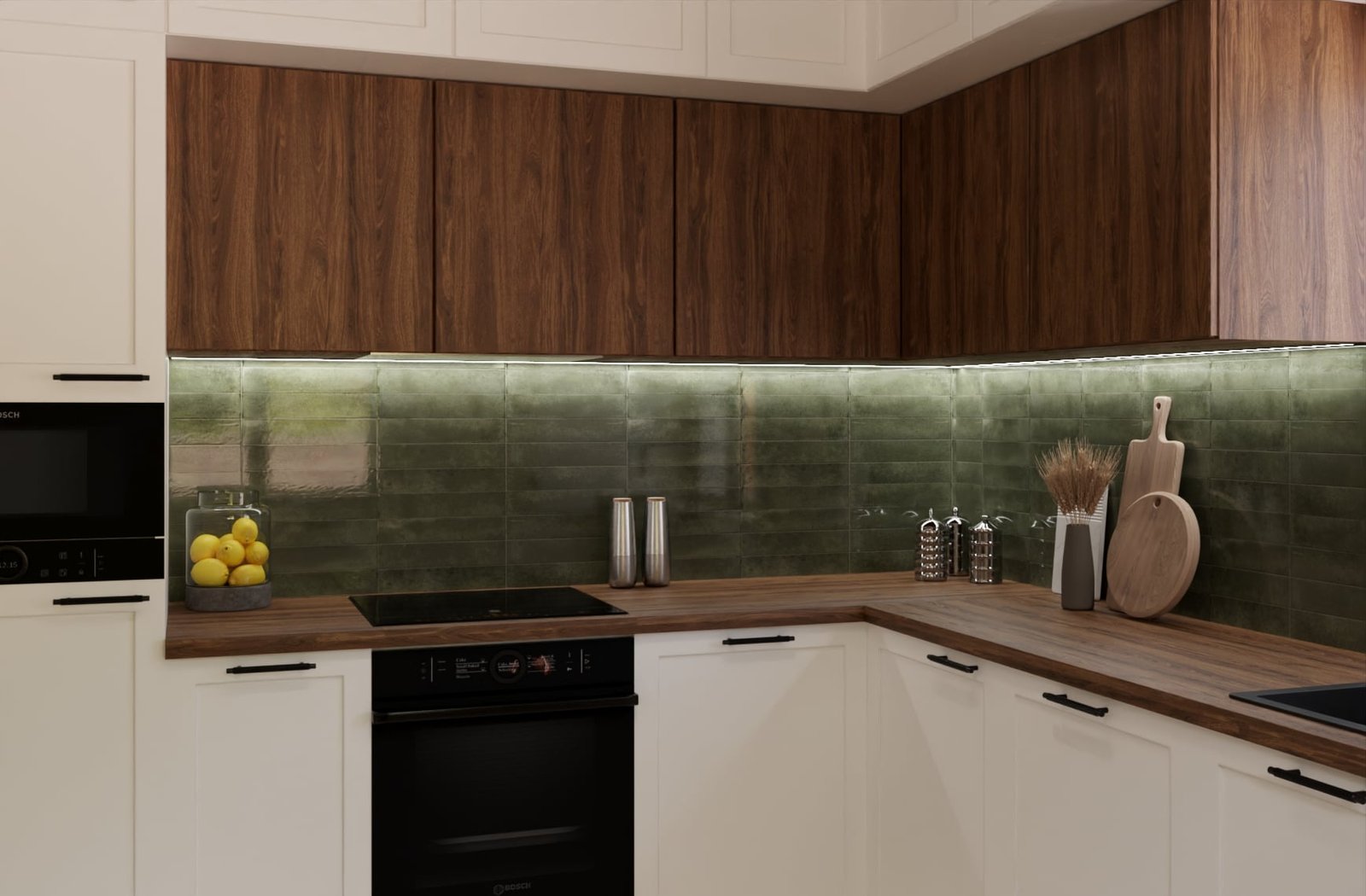 Khi thiết kế nhà bếp, điều quan trọng là tạo ra bầu không khí tươi sáng và tự nhiên, đó là lý do tại sao chúng tôi chọn tủ màu trắng kết hợp với tấm ốp tường bằng gốm màu xanh lá cây và thêm một chút gỗ óc chó để mang lại chút gợi ý cho khu vườn.
