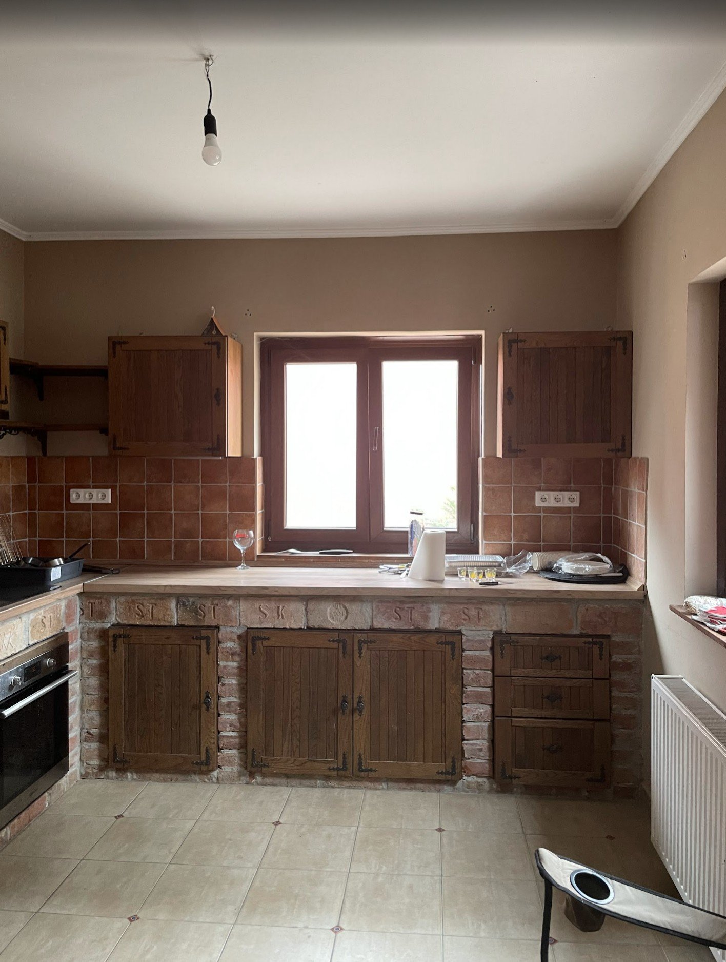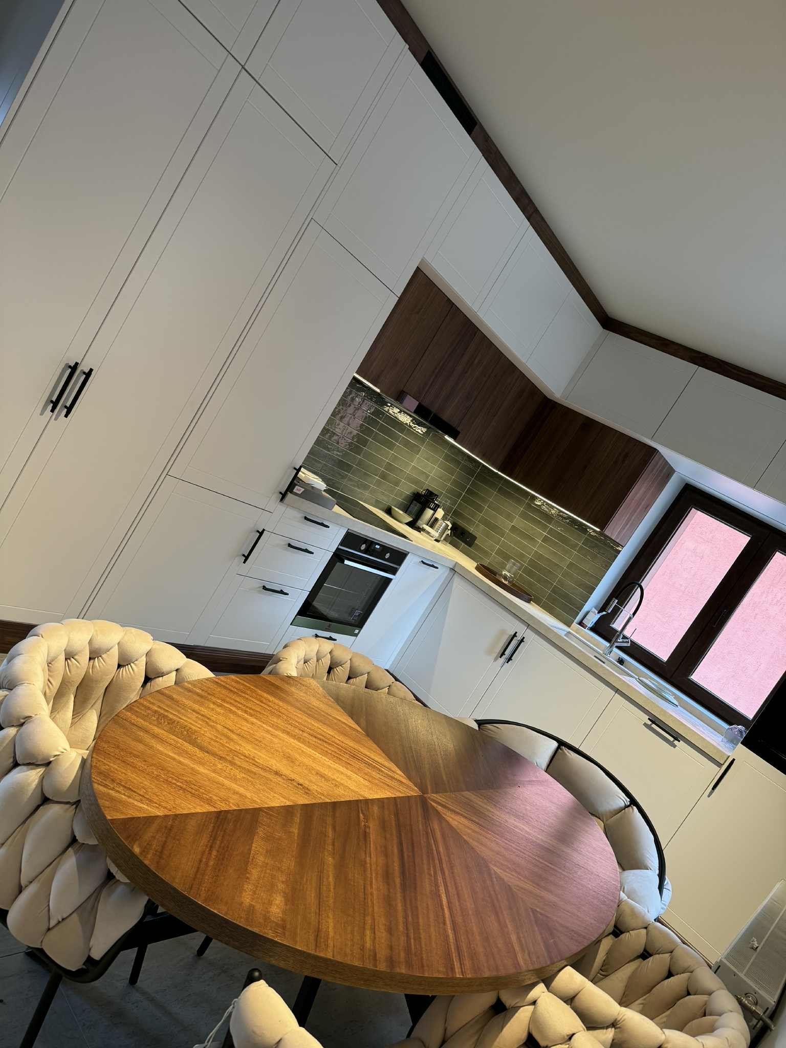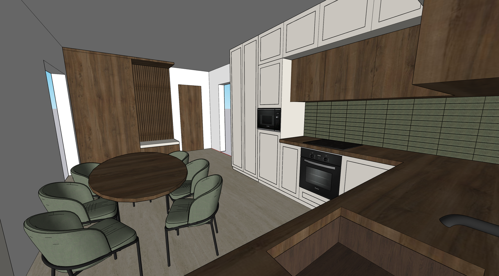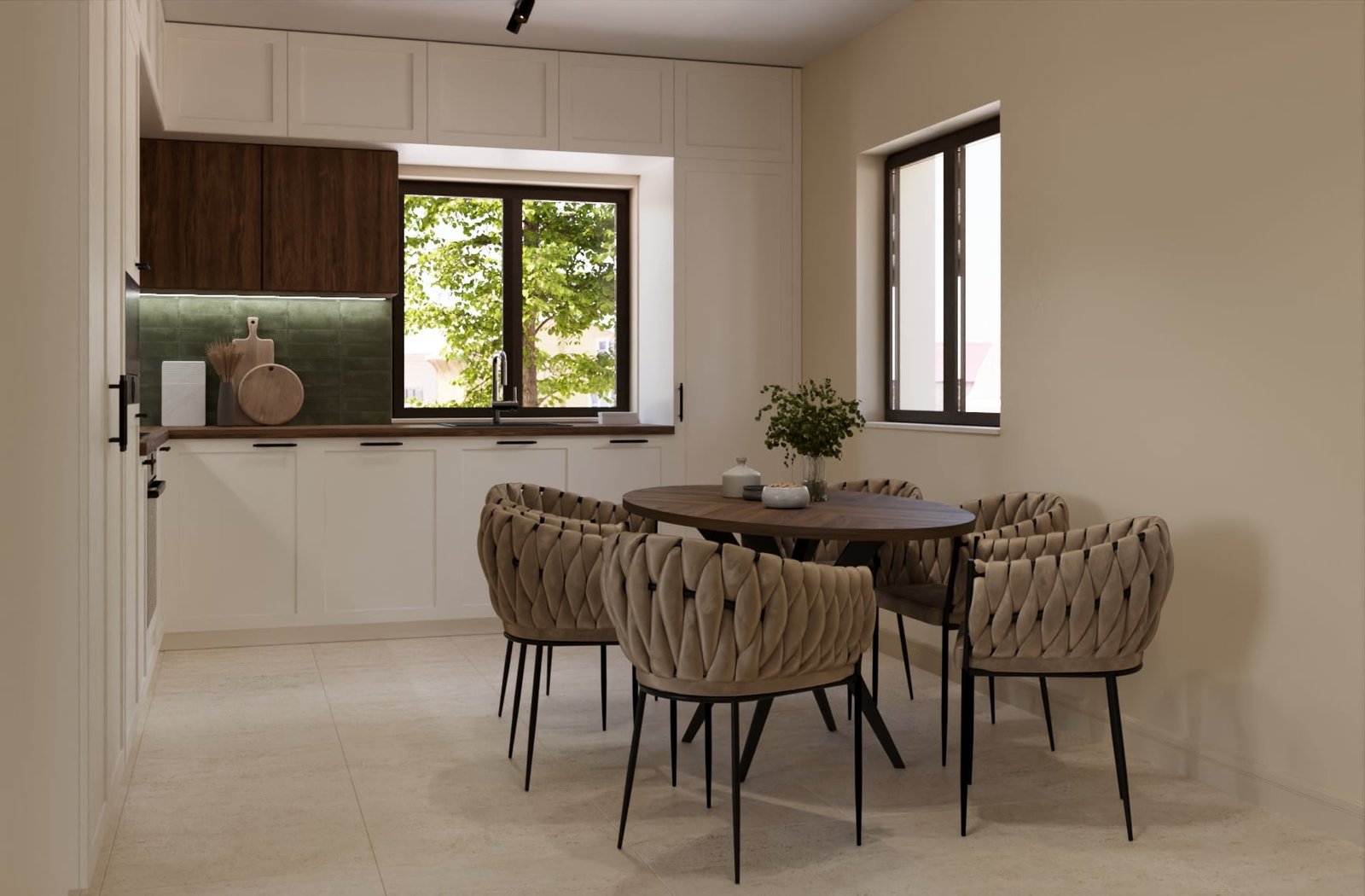 Khi thiết kế nhà bếp, điều quan trọng là tạo ra bầu không khí tươi sáng và tự nhiên, đó là lý do tại sao chúng tôi chọn tủ màu trắng kết hợp với tấm ốp tường bằng gốm màu xanh lá cây và thêm một chút gỗ óc chó để mang lại chút gợi ý cho khu vườn.
