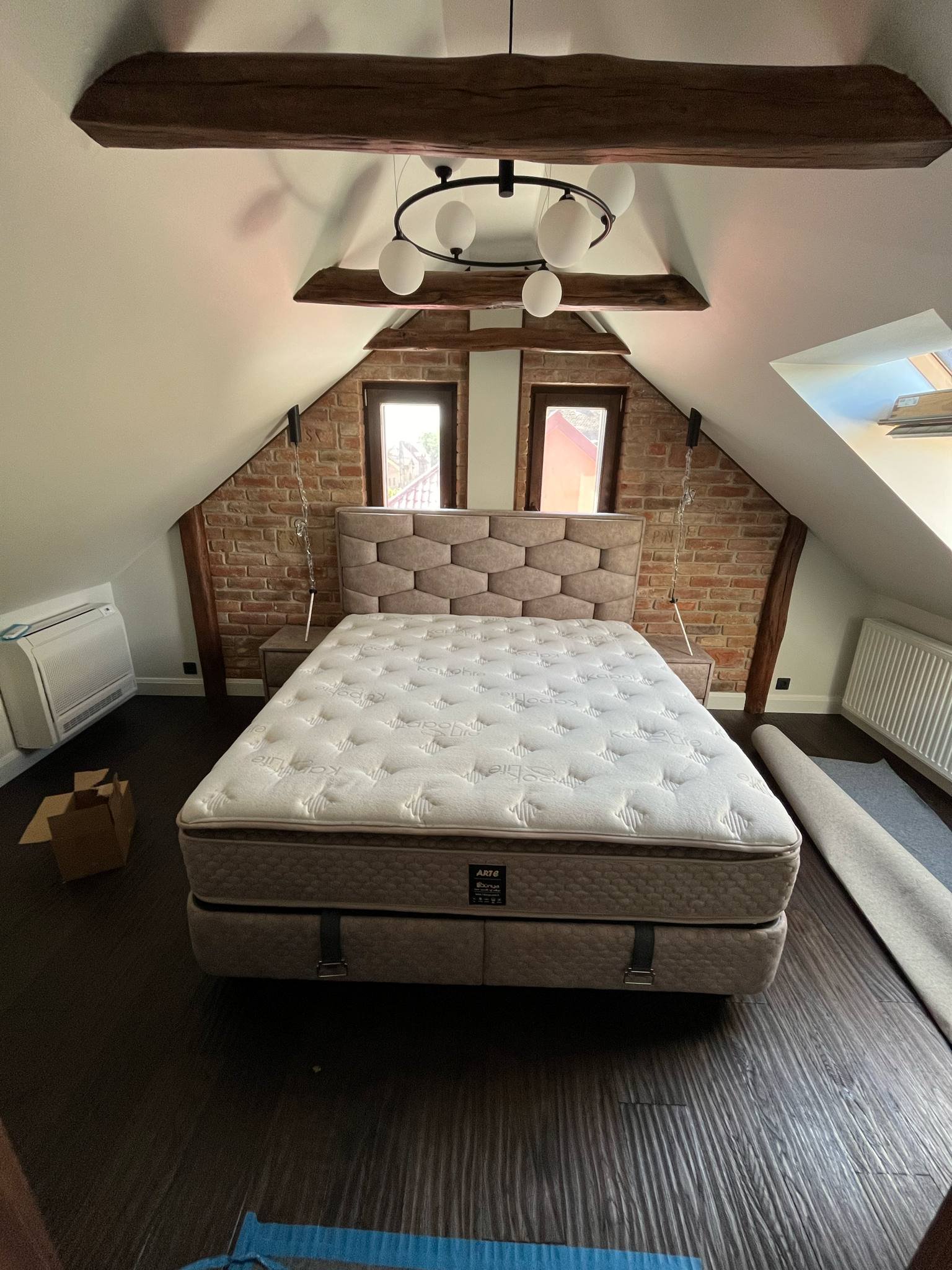 Trong phòng ngủ chính, tông màu be nhẹ nhàng làm nổi bật khung cảnh, với chiếc giường cỡ lớn, cực kỳ thoải mái làm tâm điểm.
