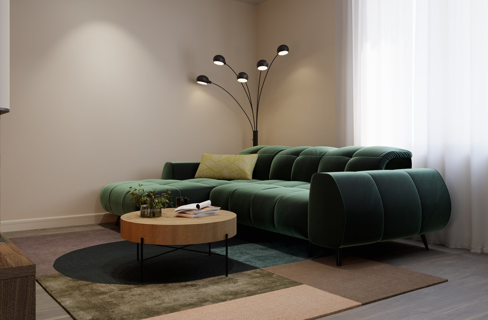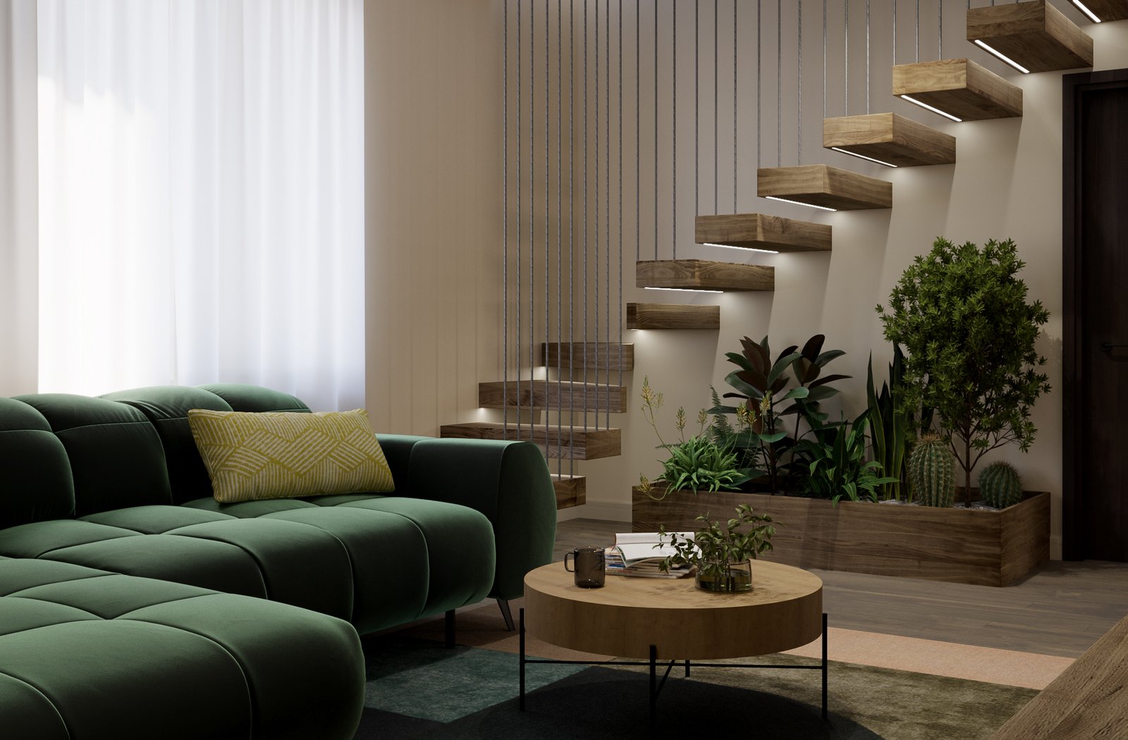 Bảng màu be hạn chế tạo nên sự tương phản nổi bật với chiếc ghế sofa nhung màu xanh lá cây, ngay lập tức thu hút sự chú ý khi bước vào không gian.