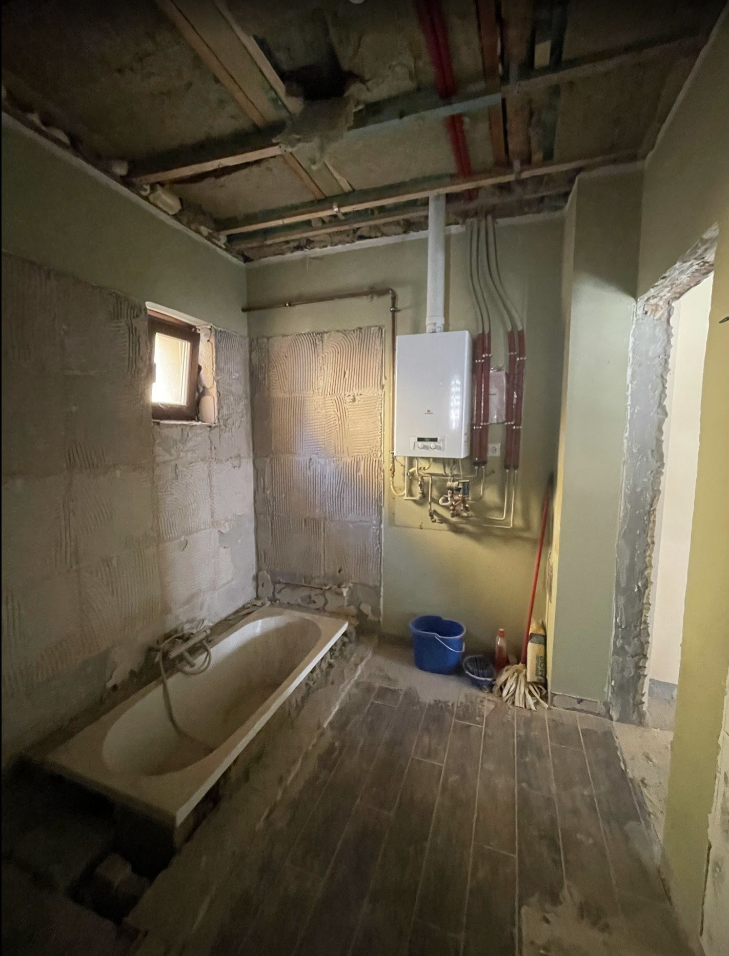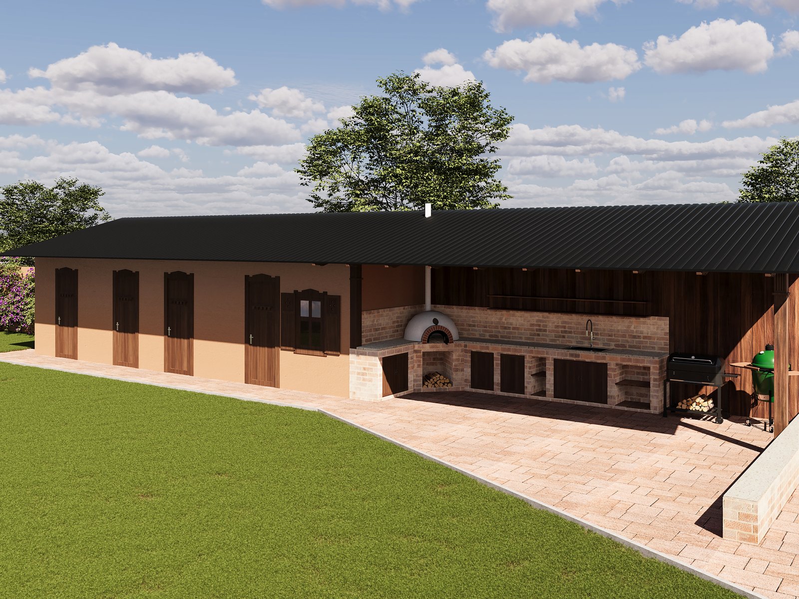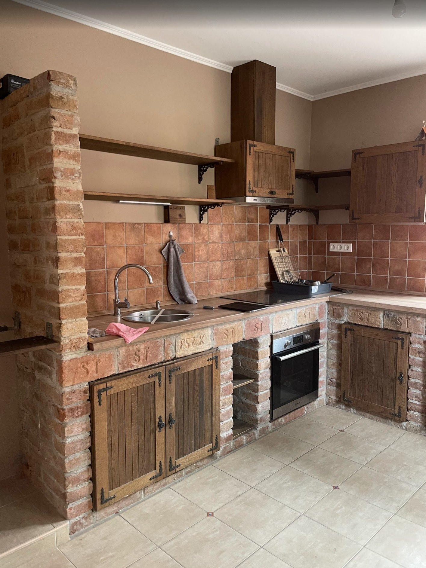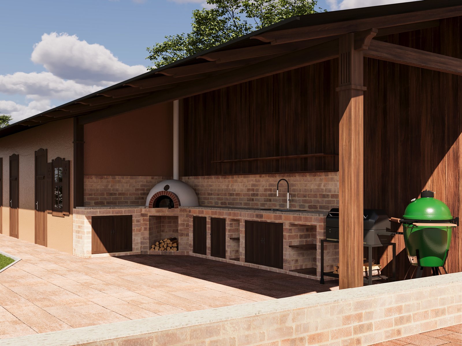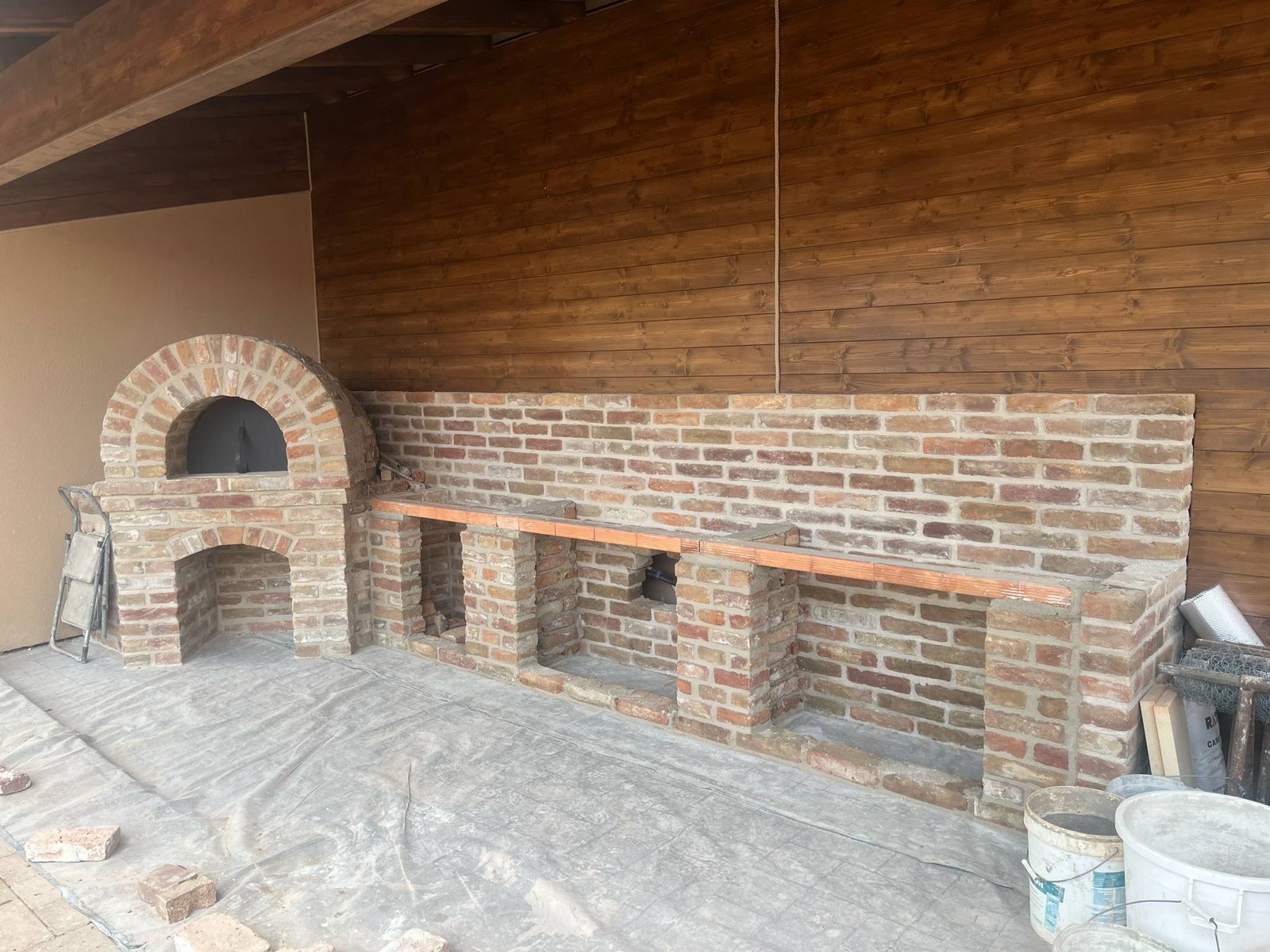 Trên sân thượng, chúng tôi đã tái sử dụng căn bếp gạch cũ trong nhà và bổ sung thêm một lò nướng bánh pizza ở góc.