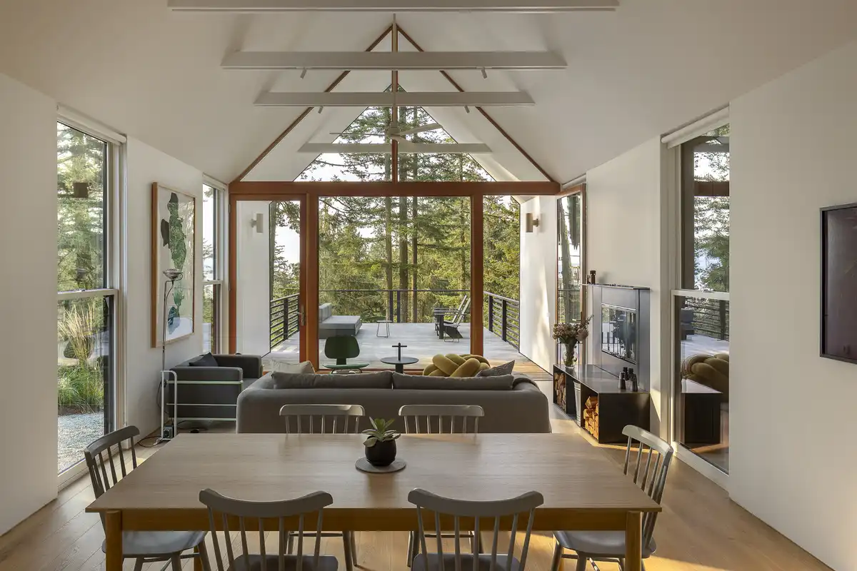 Despite its compact size, the home feels expansive through the use of tall volumes and generous openings. Full-height glazing at the gable ends amplifies this sense of space, while a rhythmic series of double-hung windows along the east and west walls brings light deep into the interior and breaks down the linearity of the plan, particularly along the hallway.