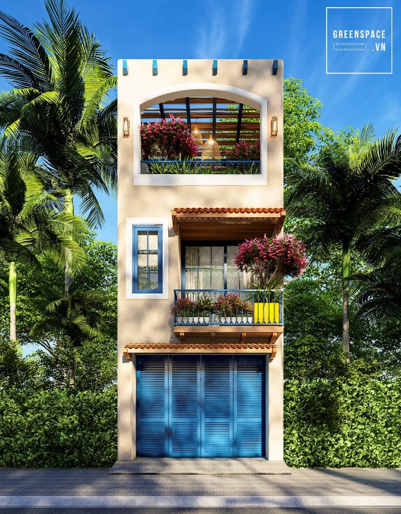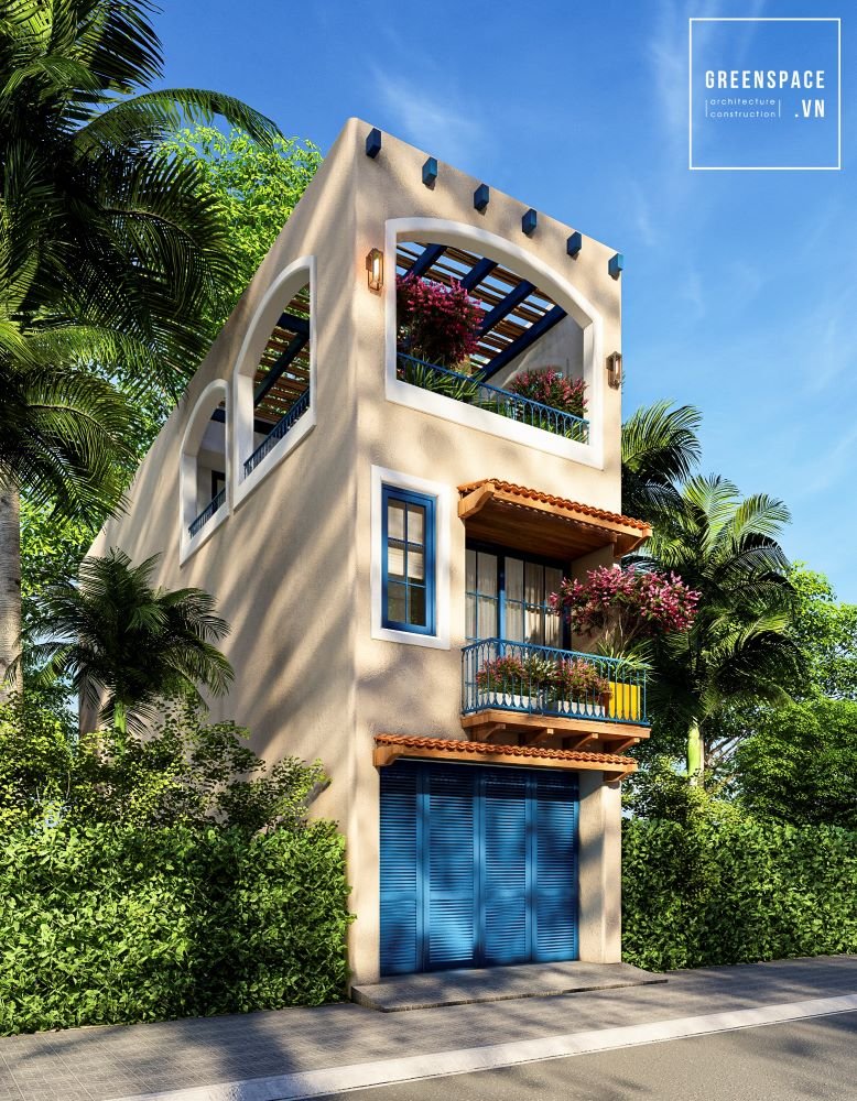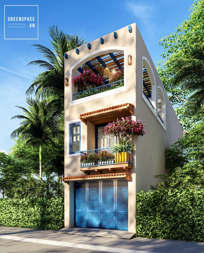 Ngôi nhà mang phong cách Địa Trung Hải phóng khoáng. Mặt tiền sử dụng gam màu be và xanh biển. Ban công trồng nhiều cây xanh và hoa rực rỡ. Cửa vòm cong mềm mại tạo điểm nhấn kiến trúc. Mái ngói đỏ đất nung đậm chất vùng biển. Hệ cửa kính lớn giúp đón ánh sáng tự nhiên. Tổng thể hài hòa giữa hiện đại và mộc mạc. Không gian bên ngoài toát lên sự tươi mới và sang trọng.