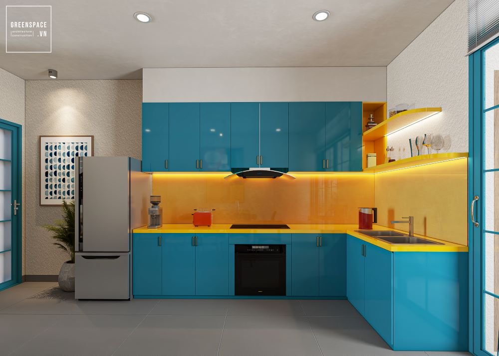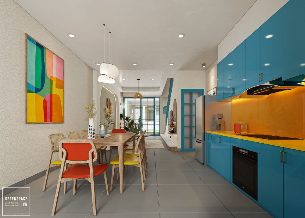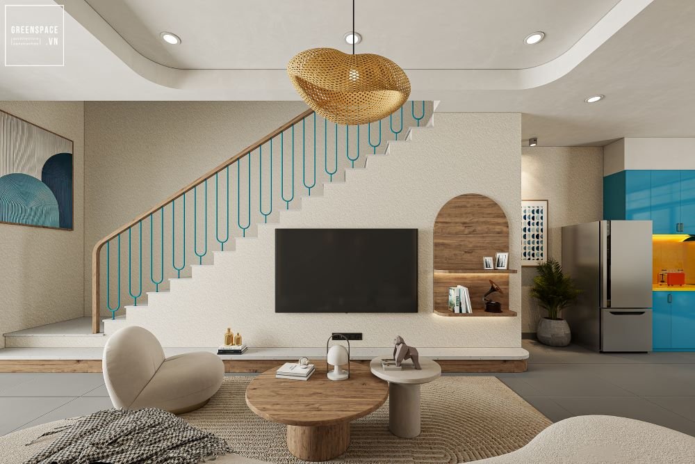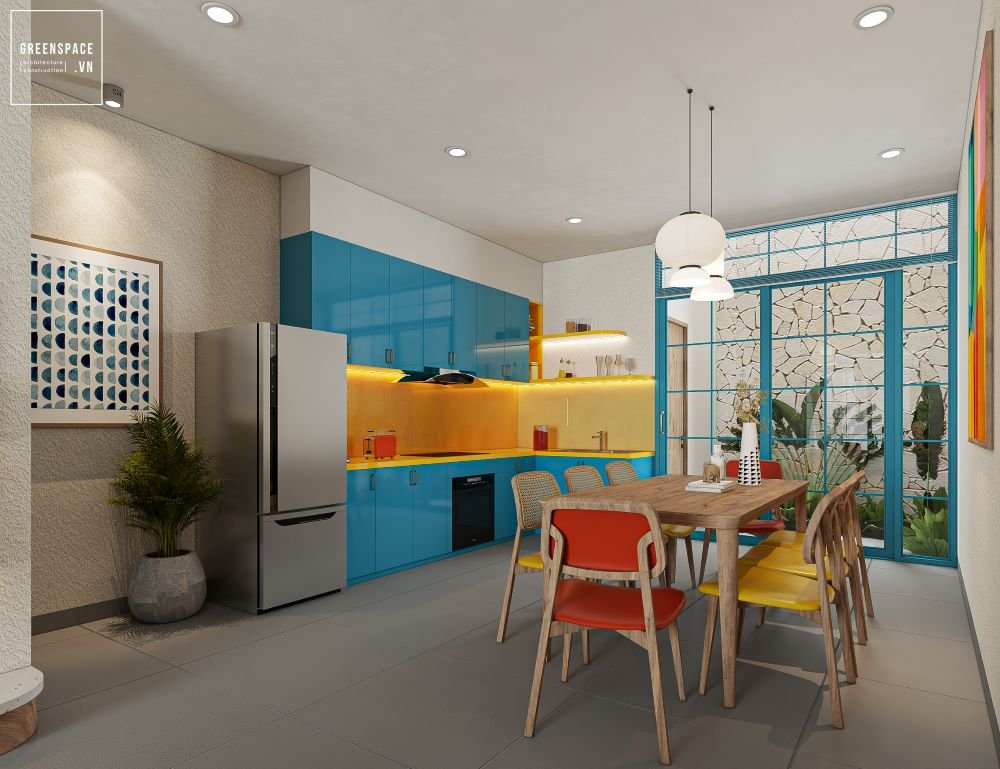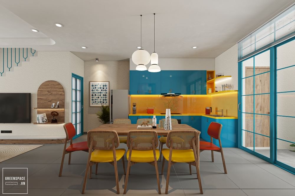 Nội thất mang gam màu xanh – vàng tươi sáng. Phòng khách thiết kế mở, kết nối bếp và sân sau. Bàn ghế gỗ kết hợp sofa vải bố nhẹ nhàng. Ánh sáng tự nhiên tràn ngập khắp không gian. Các chi tiết uốn cong tạo cảm giác mềm mại. Cầu thang bố trí giữa nhà giúp không gian thoáng. Phòng bếp nổi bật với tủ màu xanh lam. Tường trang trí tranh nghệ thuật rực rỡ. Tổng thể nội thất vừa hiện đại vừa đậm chất Địa Trung Hải.