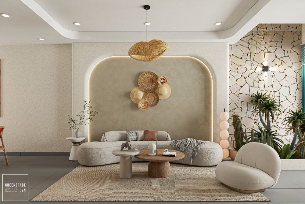 - Vật liệu: Gạch, đá tự nhiên, gỗ mộc và sơn trắng giúp tạo cảm giác gần gũi và dễ chịu.