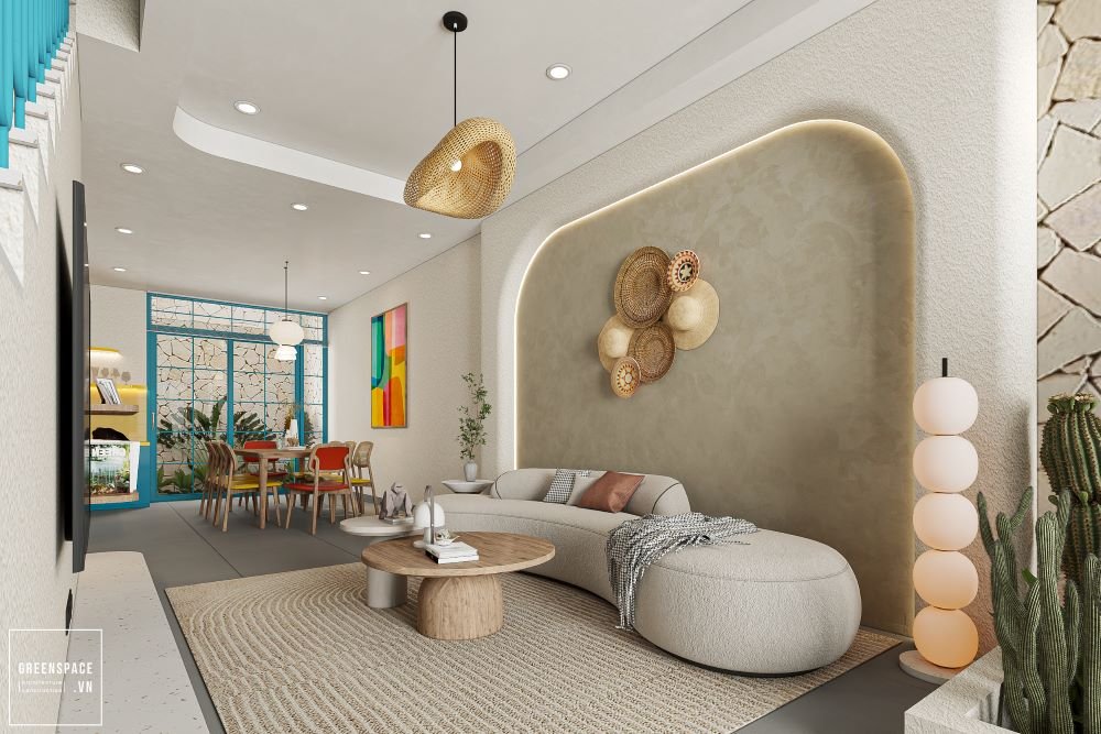 Nội thất phong cách Địa Trung Hải tập trung vào cảm giác thư giãn: sử dụng sofa vải linen, bàn gỗ thô, đèn treo bằng mây hoặc sắt rèn. Cửa sổ lớn giúp đón ánh sáng tự nhiên, mang hơi thở biển cả vào từng không gian sống.