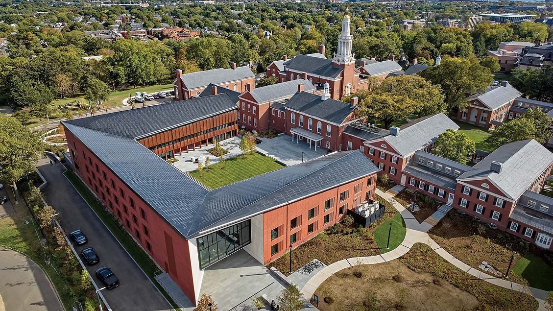 There are other contemporary takes on the Living Village’s neighbor, including the photovoltaic (PV) tile-covered roof, subtly twisted to optimize energy production (more about this later) and to create a dialogue with the slate-roofed Delano & Aldrich complex. The terra-cotta cladding references the historic pavilions’ mostly unadorned brick, while white-glazed panels at the Living Village’s northwest corner frame an entry portal and recall the whitewashed masonry in some areas of the historic quadrangle.